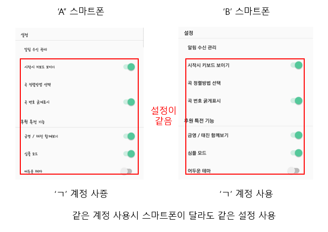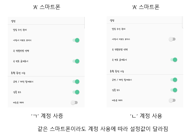 따라서 같은 스마트폰이더라도 아래와같이 다른 계정을 사용하면 각각 다른 설정값을 나타내는 것을 볼 수 있습니다.