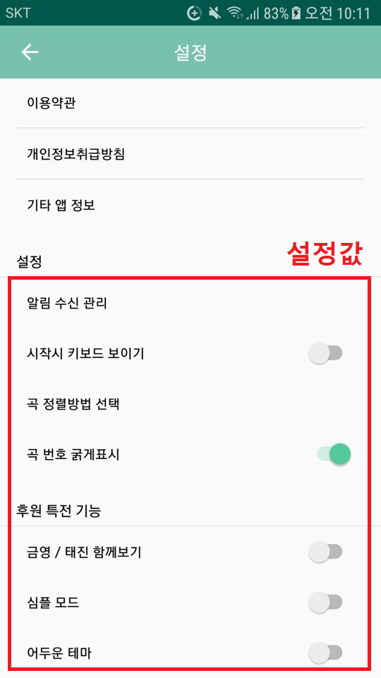 먼저 '설정값' 이란 아래와 같이 설정 항목에서 사용자가 각각 설정을 해둔 값을 의미합니다.