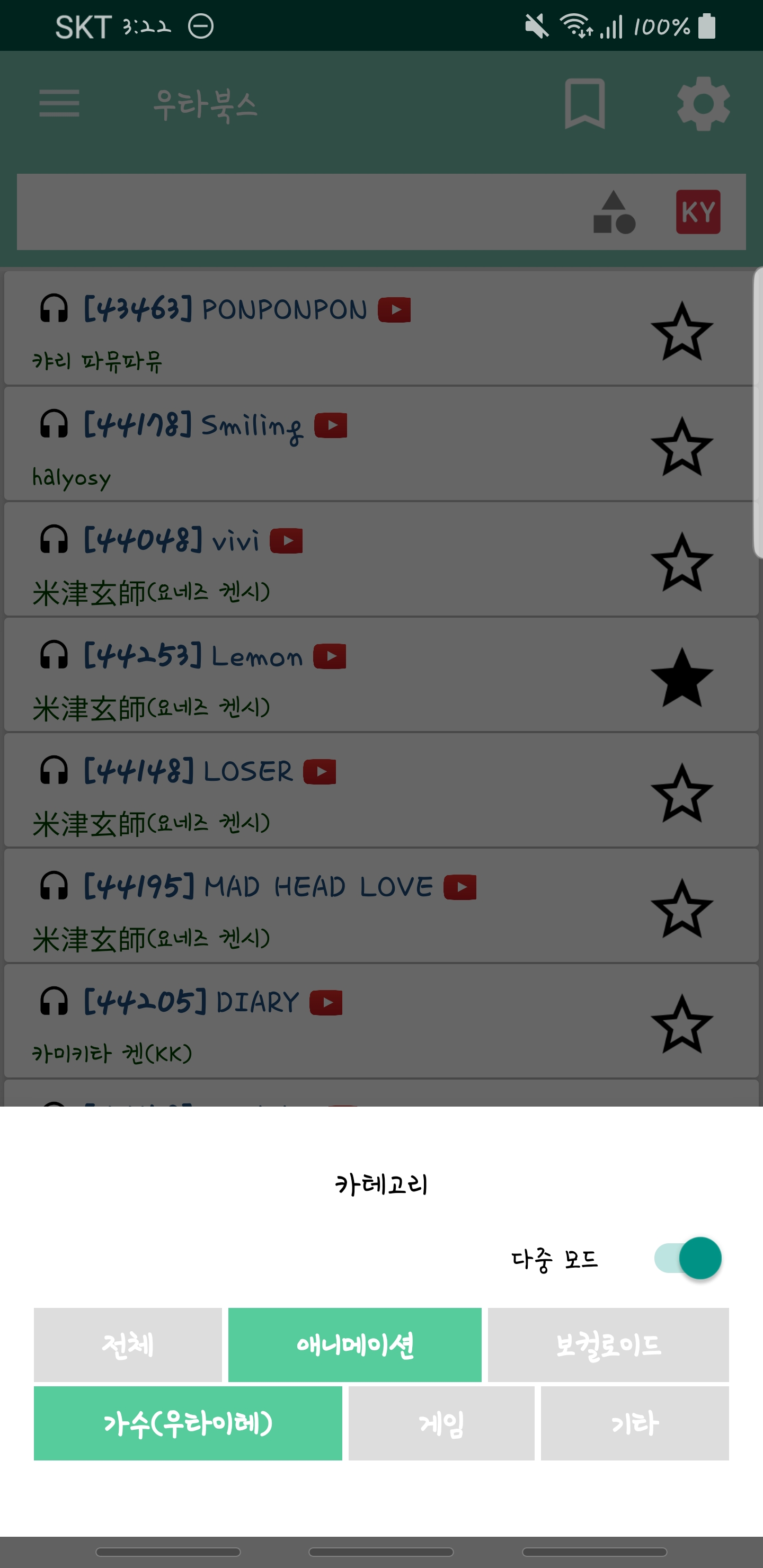 기본적으로 우타북스 계정에는 북마크 필터 유무, 카테고리, 반주기 타입(태진/금영)을 선택한 값들은 앱을 재시작 하게되면 모두 기본값으로 초기화 됩니다. 하지만 저장 모드 활성화시 설정해둔 3가지 값들이 계정에 저장이 됩니다.